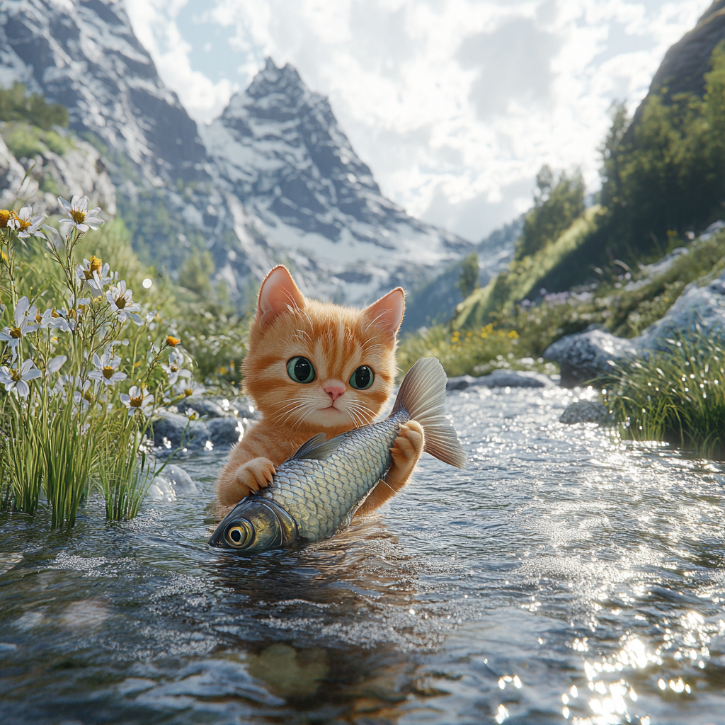 超广角视图,农家小院全貌,一位老人在菜地里浇水,旁边跟着一只花猫,院子里有几只鸡在觅食,小河在院子旁静静流淌,80年代的服饰和建筑风格让画面充满年代感,自然光下显得格外温暖。