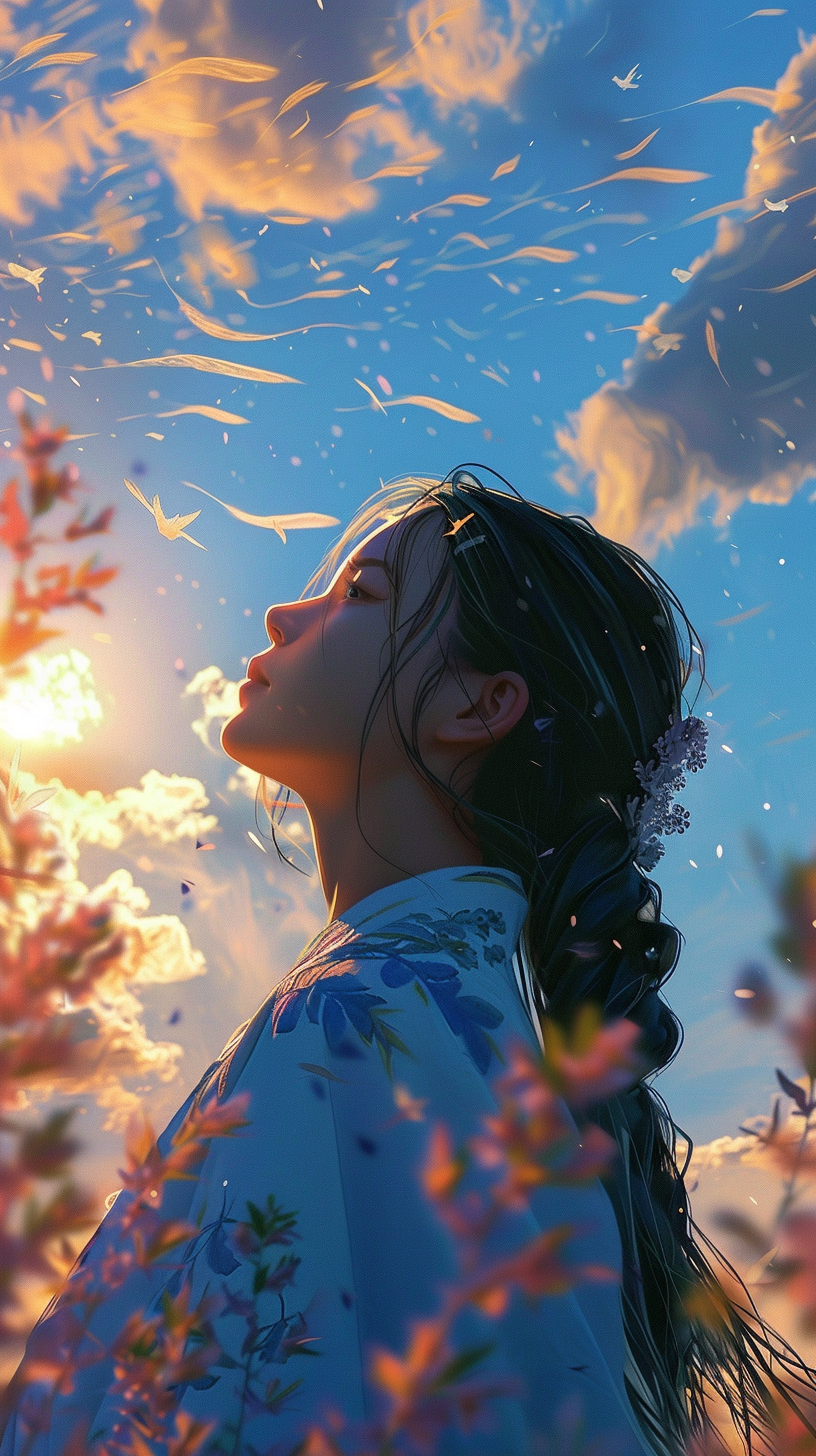 在一个美丽的小村庄里,住着一个名叫小米的小女孩。小米的后院种着一株娇艳的月季花,每年春天,它都会开出色彩斑斓的花朵,散发出浓郁的香气,吸引了许多小蜜蜂和蝴蝶。小米每天都会在花丛中嬉戏,和花朵们分享她的小秘密。图宫崎骏风格,花园里一朵美丽的百合花和一个天真无邪的小女孩开心的互动,翠绿的草地,湛蓝的天空,飘浮的白云,五颜六色的野花。童趣的、开心的。超现实主义。梦幻色彩渲染、夸张的比例表现、柔和的光线效果、背景虚化突出主体互动。超高清,超细节,镜头聚焦在一朵有魔力的月季花和小女孩身上