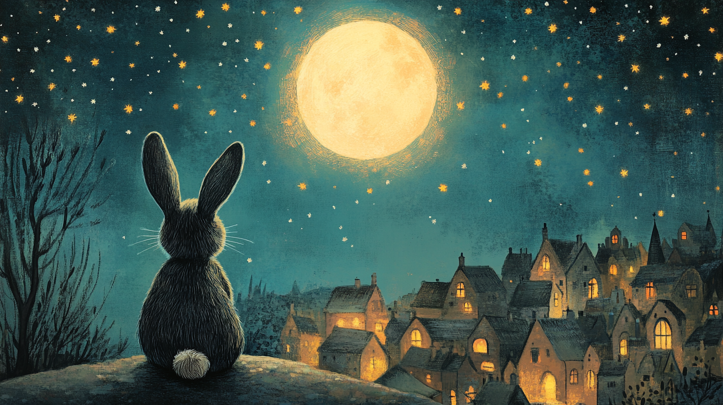 封面:小兔子米米仰望着明亮的月亮,周围有星星点缀,背景是宁静的村庄。