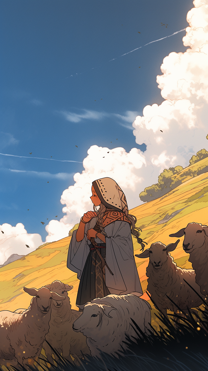 图宫崎骏风格,一个勇敢的小女孩历尽艰辛万苦寻找梅花救治母亲。女孩独自一人来到神秘的森林。夸张的比例表现、柔和的光线效果、背景虚化突出主体互动。超高清,超细节,镜头聚焦在雪狼守护梅花的场景和小女孩昂首挺胸勇敢的面对