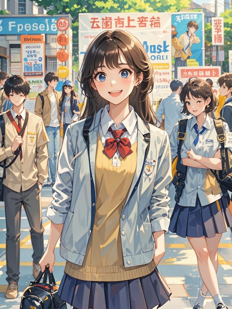 精致妆容,穿着中国高中天空蓝白色运动校服,坐在教室里,面容娇俏可爱