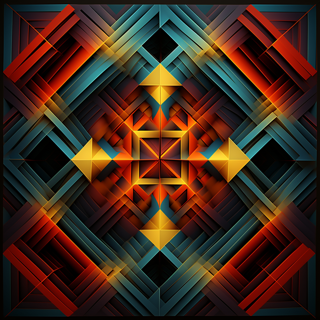 几何图案、层次分明、精细纹理、错综复杂、对称形态、线条交错、流畅节奏、迷幻效果、维度变化、光影交织、色彩丰富、视觉冲击、独特造型、凝固动感