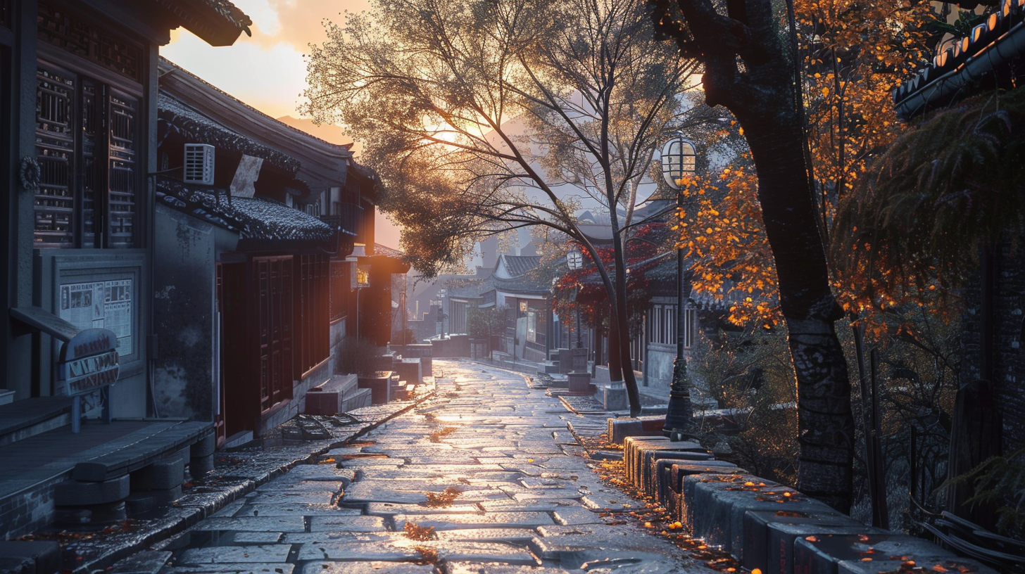 依然青翠却已略显倦意的高大枫叶树下,一片片宽大的叶片边缘悄然染上淡黄,在午后的微风中打着旋儿,轻盈地飘落在滚烫的地面。阳光穿过开始稀疏的树冠,投下晃动的光斑。