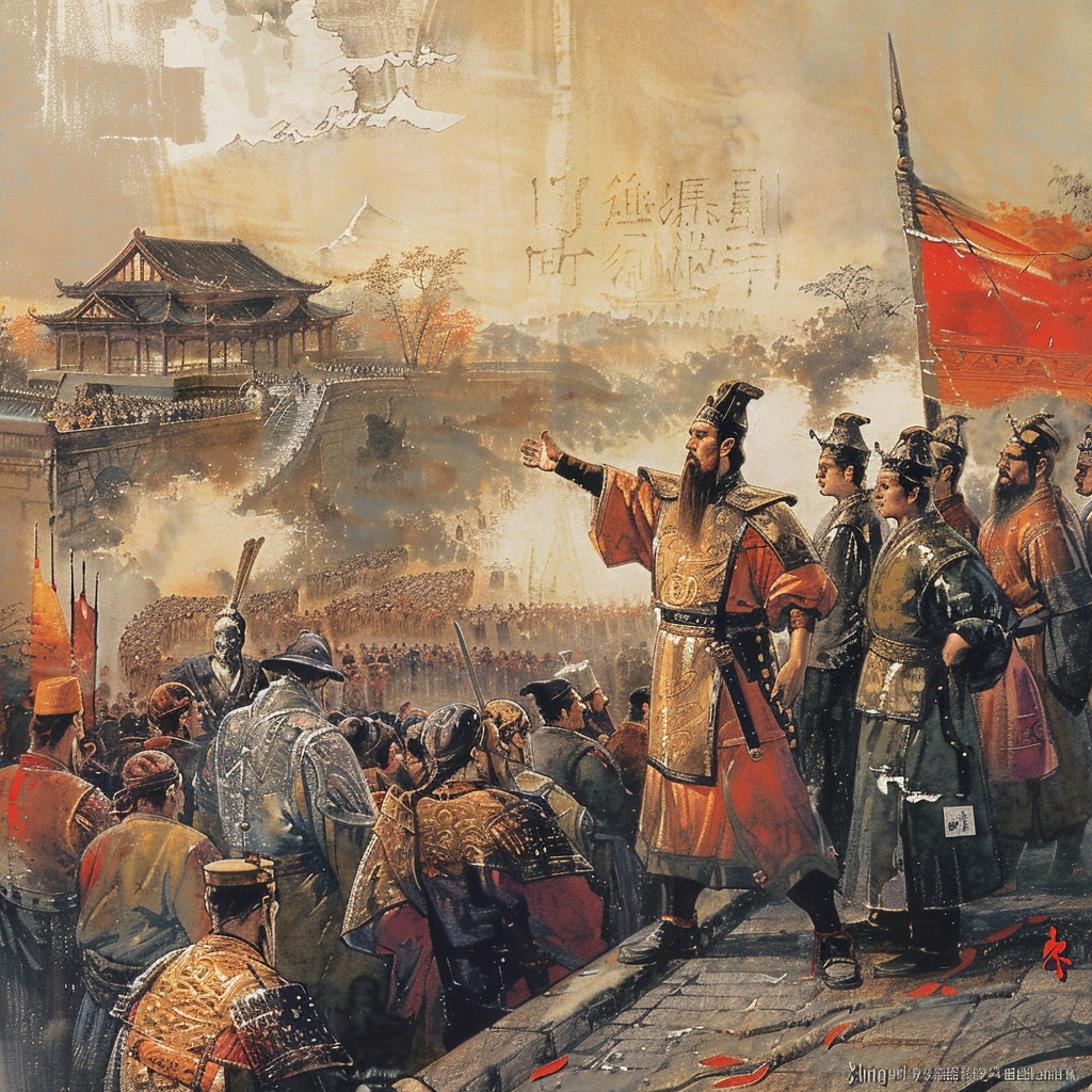 场景构图:司马迁以跪坐姿态居于画面中央,身后夯土墙面肌理斑驳,表面可见竹篾编织纹路与风化裂痕。左侧斜置梯形竹简架,分三层堆叠近百卷简册,部分简牒边缘磨损露出竹纤维。右后方立式木格窗棂间透出深青色夜空,一截虬曲枯枝横斜,弦月冷光在简册表面投下龟甲状格栅阴影。人物细节:司马迁面部呈深麦色,眉弓骨突出形成深邃眼窝,眼角鱼尾纹如刀刻般延伸至鬓角。鼻梁挺直但鼻翼两侧法令纹明显,下颌线条因缺齿稍显松弛。唇色苍白无血色,下巴光洁无任何须根残留。灰白头发以麻布巾扎成椎髻,发际线后移露出宽阔前额,耳际散落数缕银丝。服饰考据:身着右衽曲裾深衣,衣料为粗织苎麻本色,领缘及袖口镶靛青细边(宽度0.8厘米符合马王堆出土实物)。腰间束两指宽葛布带,左侧悬青玉髓印章(参考满城汉墓组佩形制)。曲裾下摆自然铺展于苇席,露出磨损严重的翘头布履,鞋底可见多次修补的葛麻补丁。器物陈设:1. 髹漆松木案几(长120cm×宽60cm×高30cm)表面细密龟裂纹中沁入墨渍,右端置错金云气纹博山炉,炉体高15cm,山形盖镂空处逸出青烟呈螺旋上升。2. 左案角青铜雁鱼灯展开双翼,灯盘盛半凝羊脂,灯烟经雁颈导入腹部清水。灯影在简面投射出水波纹,与墨字形成动态叠