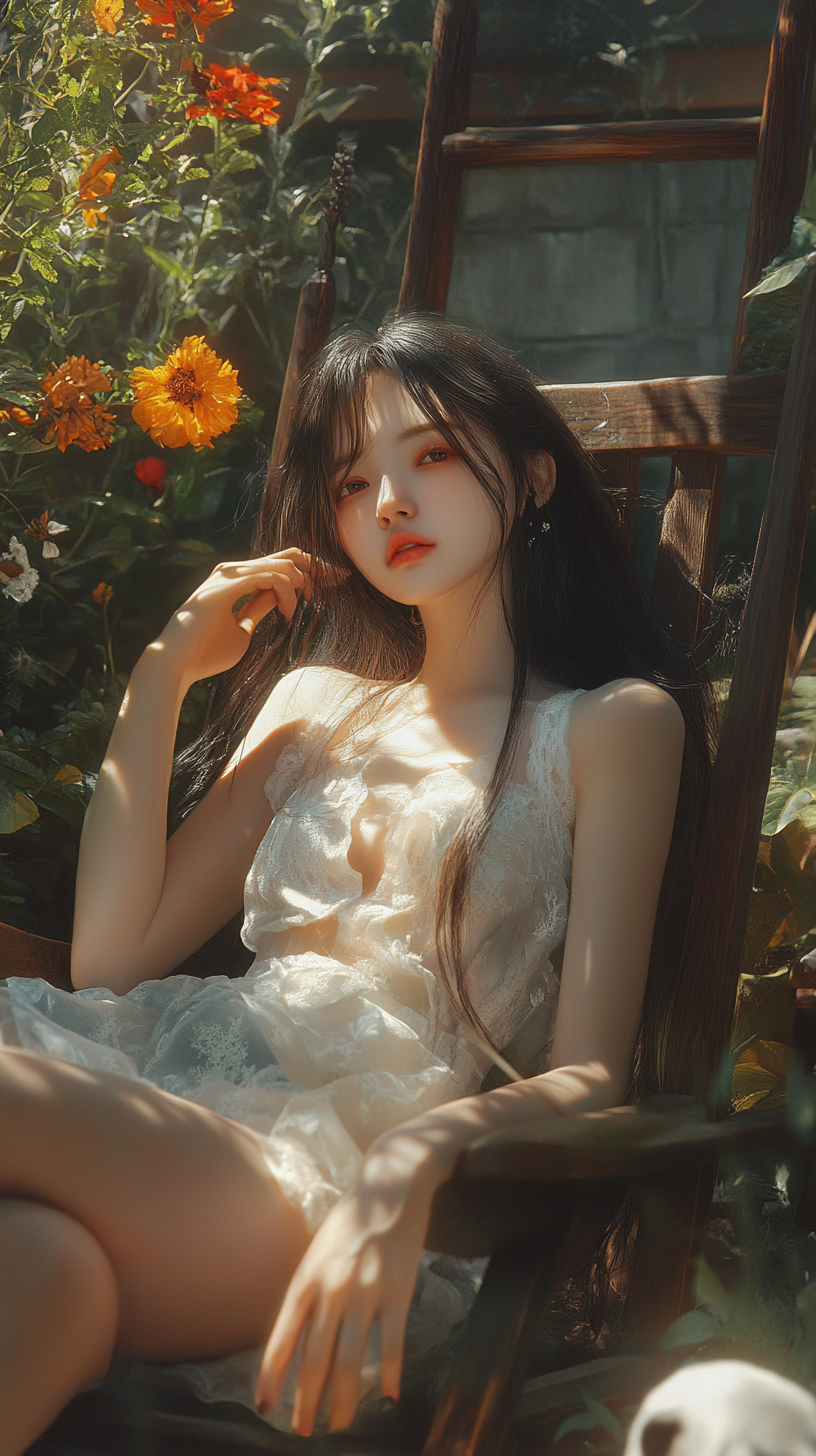 一个女生,碧城水芯搭配风,阳台,植物,小溪,裙子,披发,手链,侧脸,精致的五官,春天