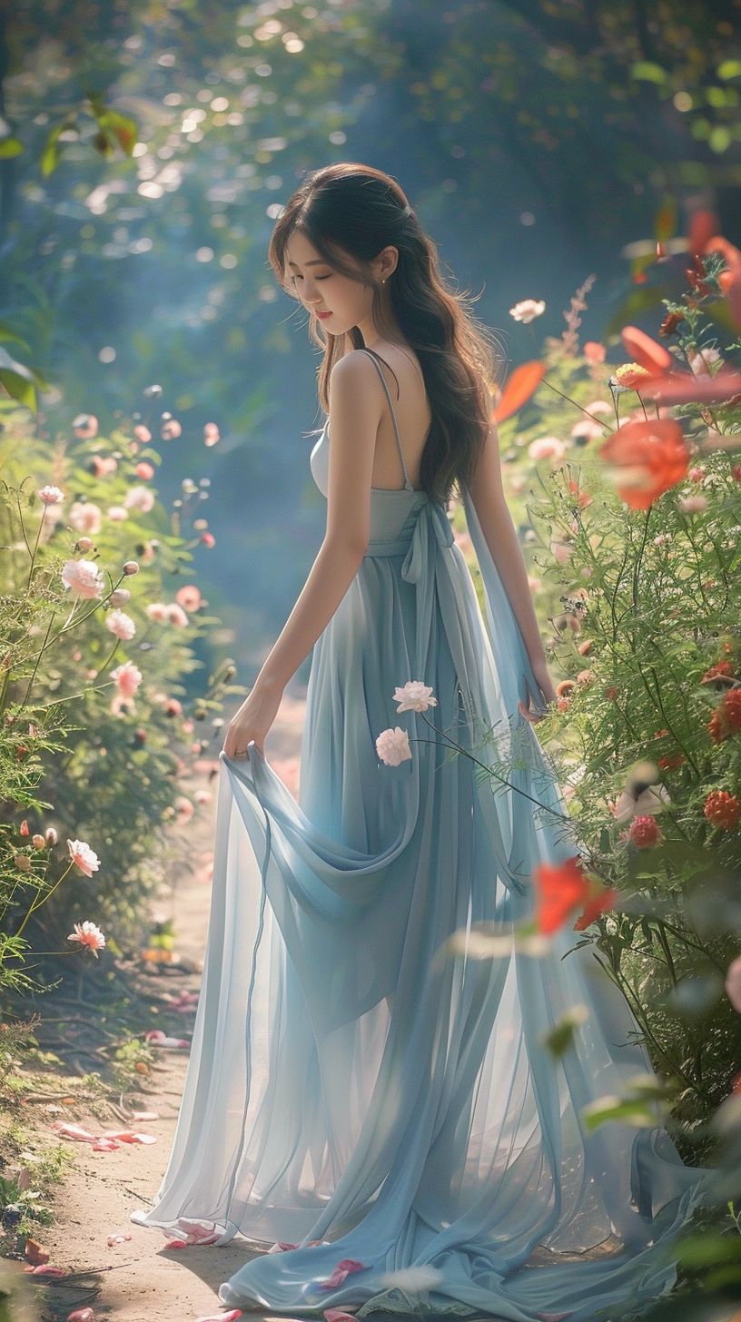 一个女生,碧城水芯搭配风,阳台,植物,小溪,裙子,披发,手链,侧脸,精致的五官,春天