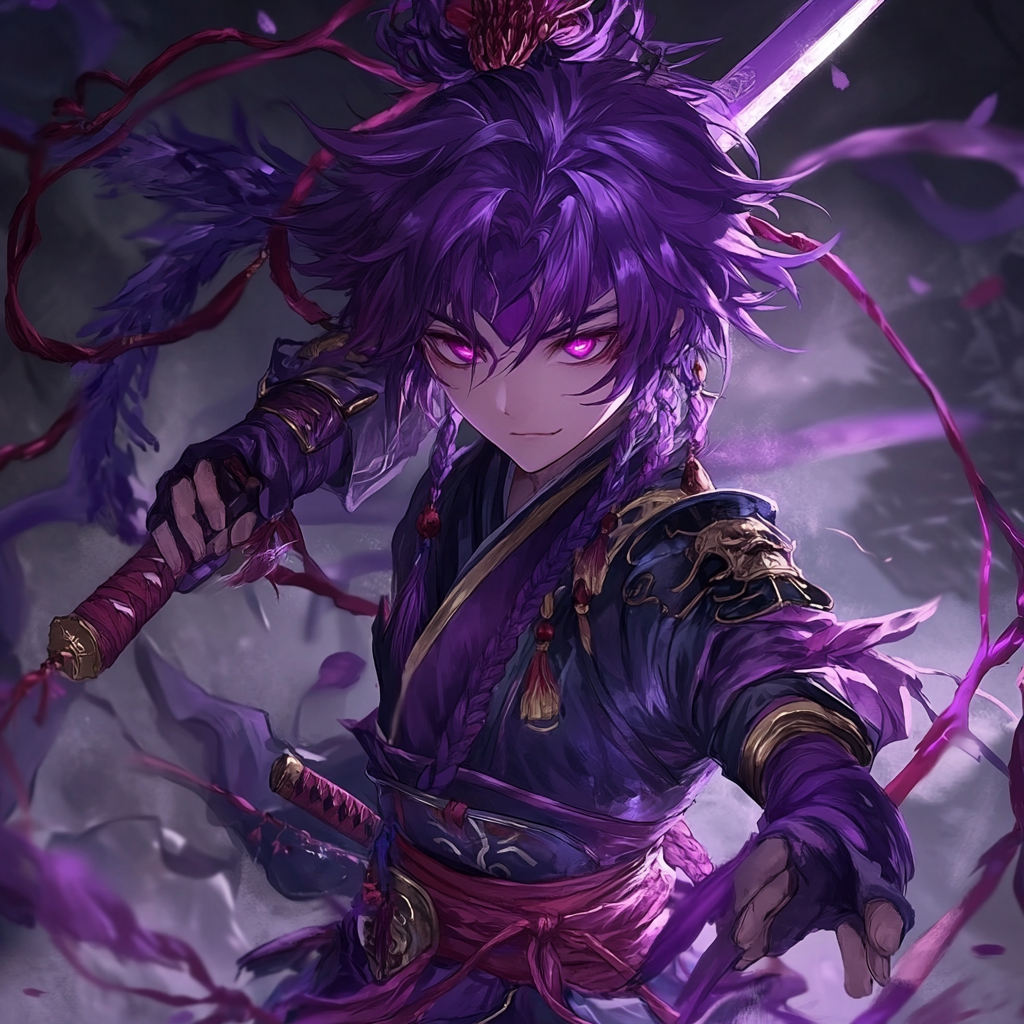 紫色头发和双眸,穿着一身灵装,手拿一把紫色大剑,头上扎着用红色丝线制成的蝴蝶结,