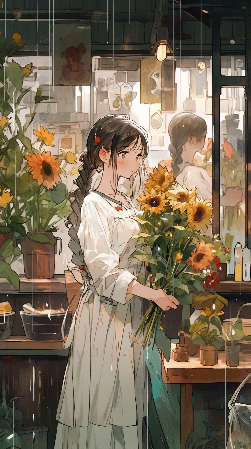 路边两边垂柳盛开,粉色紫色鲜花盛开,路的尽头是一个酒家,酒家的名字是LUCk浓酒馆,酒家院子里鲜花盛开,有向日葵、绣球花。一个身材健朗、英俊,穿着白衬衣的男子拉着一个身材高挑,大波浪长发头戴蝴蝶结,穿着白色连衣裙的女子走向酒家。漫画风格