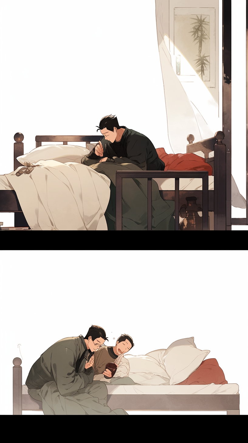 场景构图:司马迁以跪坐姿态居于画面中央,身后夯土墙面肌理斑驳,表面可见竹篾编织纹路与风化裂痕。左侧斜置梯形竹简架,分三层堆叠近百卷简册,部分简牒边缘磨损露出竹纤维。右后方立式木格窗棂间透出深青色夜空,一截虬曲枯枝横斜,弦月冷光在简册表面投下龟甲状格栅阴影。人物细节:司马迁面部呈深麦色,眉弓骨突出形成深邃眼窝,眼角鱼尾纹如刀刻般延伸至鬓角。鼻梁挺直但鼻翼两侧法令纹明显,下颌线条因缺齿稍显松弛。唇色苍白无血色,下巴光洁无任何须根残留。灰白头发以麻布巾扎成椎髻,发际线后移露出宽阔前额,耳际散落数缕银丝。服饰考据:身着右衽曲裾深衣,衣料为粗织苎麻本色,领缘及袖口镶靛青细边(宽度0.8厘米符合马王堆出土实物)。腰间束两指宽葛布带,左侧悬青玉髓印章(参考满城汉墓组佩形制)。曲裾下摆自然铺展于苇席,露出磨损严重的翘头布履,鞋底可见多次修补的葛麻补丁。器物陈设:1. 髹漆松木案几(长120cm×宽60cm×高30cm)表面细密龟裂纹中沁入墨渍,右端置错金云气纹博山炉,炉体高15cm,山形盖镂空处逸出青烟呈螺旋上升。2. 左案角青铜雁鱼灯展开双翼,灯盘盛半凝羊脂,灯烟经雁颈导入腹部清水。灯影在简面投射出水波纹,与墨字形成动态叠