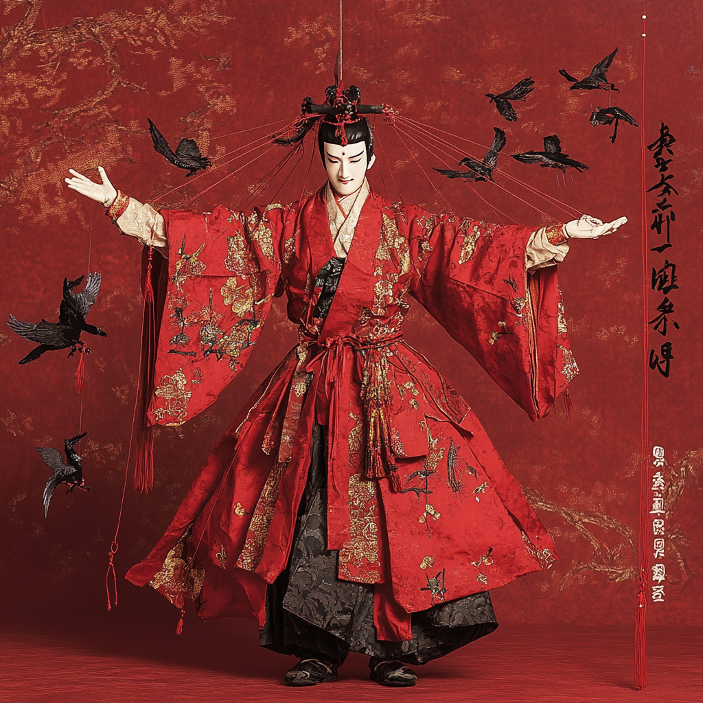 场景构图:司马迁以跪坐姿态居于画面中央,身后夯土墙面肌理斑驳,表面可见竹篾编织纹路与风化裂痕。左侧斜置梯形竹简架,分三层堆叠近百卷简册,部分简牒边缘磨损露出竹纤维。右后方立式木格窗棂间透出深青色夜空,一截虬曲枯枝横斜,弦月冷光在简册表面投下龟甲状格栅阴影。人物细节:司马迁面部呈深麦色,眉弓骨突出形成深邃眼窝,眼角鱼尾纹如刀刻般延伸至鬓角。鼻梁挺直但鼻翼两侧法令纹明显,下颌线条因缺齿稍显松弛。唇色苍白无血色,下巴光洁无任何须根残留。灰白头发以麻布巾扎成椎髻,发际线后移露出宽阔前额,耳际散落数缕银丝。服饰考据:身着右衽曲裾深衣,衣料为粗织苎麻本色,领缘及袖口镶靛青细边(宽度0.8厘米符合马王堆出土实物)。腰间束两指宽葛布带,左侧悬青玉髓印章(参考满城汉墓组佩形制)。曲裾下摆自然铺展于苇席,露出磨损严重的翘头布履,鞋底可见多次修补的葛麻补丁。器物陈设:1. 髹漆松木案几(长120cm×宽60cm×高30cm)表面细密龟裂纹中沁入墨渍,右端置错金云气纹博山炉,炉体高15cm,山形盖镂空处逸出青烟呈螺旋上升。2. 左案角青铜雁鱼灯展开双翼,灯盘盛半凝羊脂,灯烟经雁颈导入腹部清水。灯影在简面投射出水波纹,与墨字形成动态叠