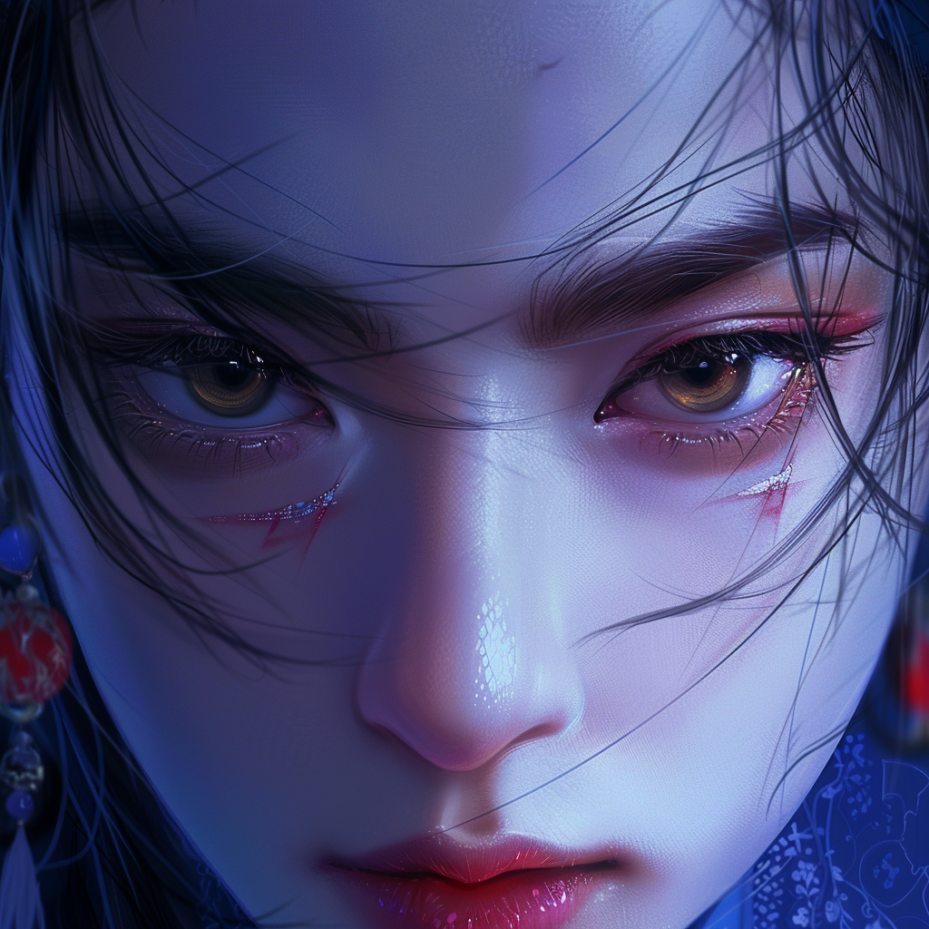 场景构图:司马迁以跪坐姿态居于画面中央,身后夯土墙面肌理斑驳,表面可见竹篾编织纹路与风化裂痕。左侧斜置梯形竹简架,分三层堆叠近百卷简册,部分简牒边缘磨损露出竹纤维。右后方立式木格窗棂间透出深青色夜空,一截虬曲枯枝横斜,弦月冷光在简册表面投下龟甲状格栅阴影。人物细节:司马迁面部呈深麦色,眉弓骨突出形成深邃眼窝,眼角鱼尾纹如刀刻般延伸至鬓角。鼻梁挺直但鼻翼两侧法令纹明显,下颌线条因缺齿稍显松弛。唇色苍白无血色,下巴光洁无任何须根残留。灰白头发以麻布巾扎成椎髻,发际线后移露出宽阔前额,耳际散落数缕银丝。服饰考据:身着右衽曲裾深衣,衣料为粗织苎麻本色,领缘及袖口镶靛青细边(宽度0.8厘米符合马王堆出土实物)。腰间束两指宽葛布带,左侧悬青玉髓印章(参考满城汉墓组佩形制)。曲裾下摆自然铺展于苇席,露出磨损严重的翘头布履,鞋底可见多次修补的葛麻补丁。器物陈设:1. 髹漆松木案几(长120cm×宽60cm×高30cm)表面细密龟裂纹中沁入墨渍,右端置错金云气纹博山炉,炉体高15cm,山形盖镂空处逸出青烟呈螺旋上升。2. 左案角青铜雁鱼灯展开双翼,灯盘盛半凝羊脂,灯烟经雁颈导入腹部清水。灯影在简面投射出水波纹,与墨字形成动态叠
