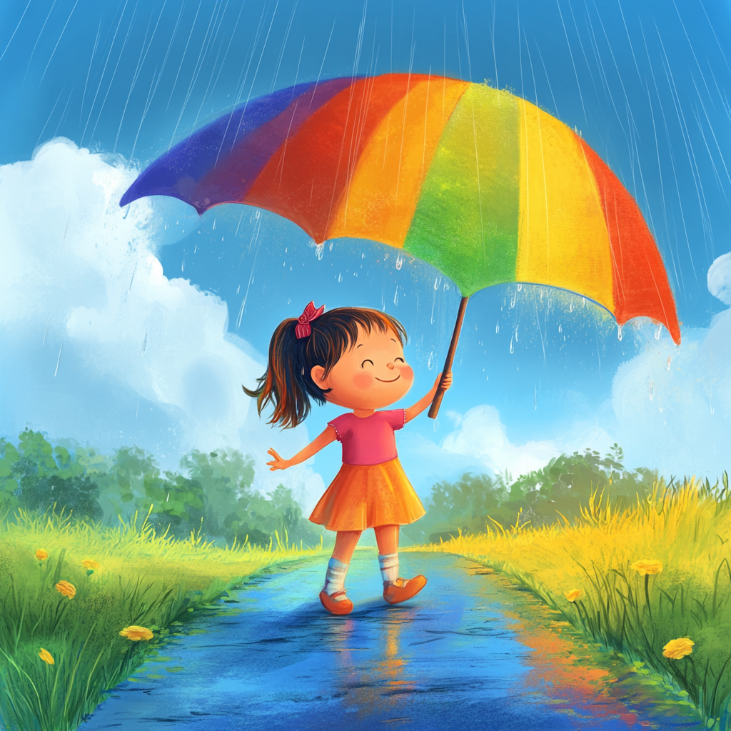 这是一个充满童趣和美好的画面呀!雨后天空放晴出现的七彩彩虹,拥有着世界上所有鲜艳美丽的颜色,而小女孩在这绚烂的彩虹下欢快跳舞,以卡通动漫和儿童绘本的形式来呈现,一定会特别吸引小朋友,让人感受到满满的纯真和快乐。