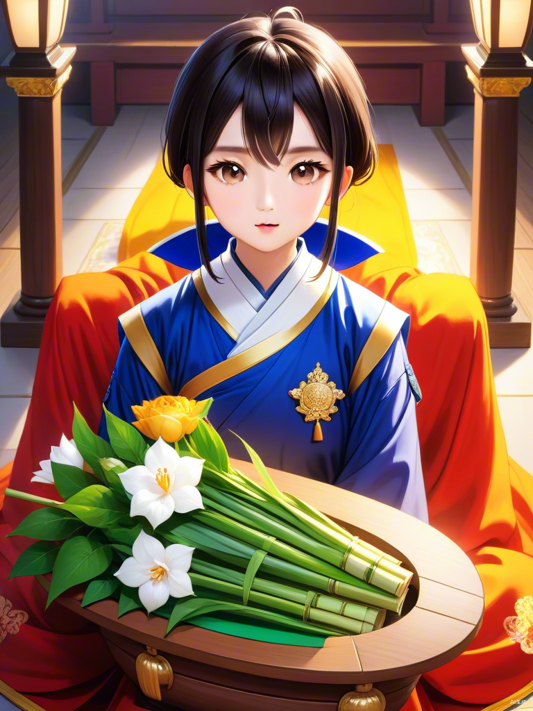 在一个美丽的小村庄里,住着一个名叫小米的小女孩。小米的后院种着一株娇艳的月季花,每年春天,它都会开出色彩斑斓的花朵,散发出浓郁的香气,吸引了许多小蜜蜂和蝴蝶。小米每天都会在花丛中嬉戏,和花朵们分享她的小秘密。图宫崎骏风格,花园里一朵美丽的百合花和一个天真无邪的小女孩开心的互动,翠绿的草地,湛蓝的天空,飘浮的白云,五颜六色的野花。童趣的、开心的。超现实主义。梦幻色彩渲染、夸张的比例表现、柔和的光线效果、背景虚化突出主体互动。超高清,超细节,镜头聚焦在一朵有魔力的月季花和小女孩身上
