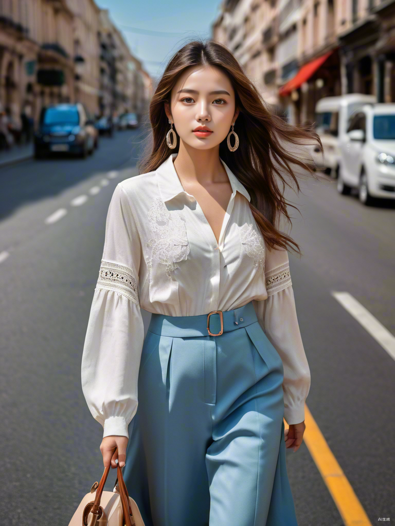 一条宽阔的双向车行道呈缓坡向下延伸,仿佛是大地铺展的丝带。道路两旁是修剪整齐、绿意盎然的草坪,如同柔软的绿毯。草坪上矗立着两排参天大树,它们冠幅超大,粗壮的枝干向四周伸展。枝头密密麻麻地开满了蓝色花朵,花瓣如蝶翼般轻盈。两排大树的树冠相互交织,形成了一条梦幻般的拱形蓝花大道。阳光透过蓝花的缝隙洒下,在路面上形成一片片斑斓的光影。双向两车道的路面上,星星点点地散落着蓝色花瓣,仿佛是大自然洒落的浪漫诗篇。整个画面干净明亮,大气唯美,宛如大师笔下的绝美画卷,尽显高清、高品质之美。