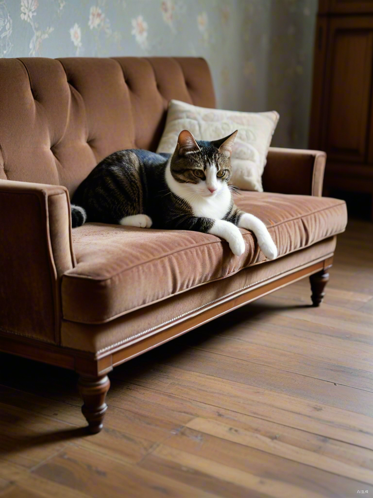 一只猫戴着墨镜坐在沙发上喝着红酒,抓拍风格。