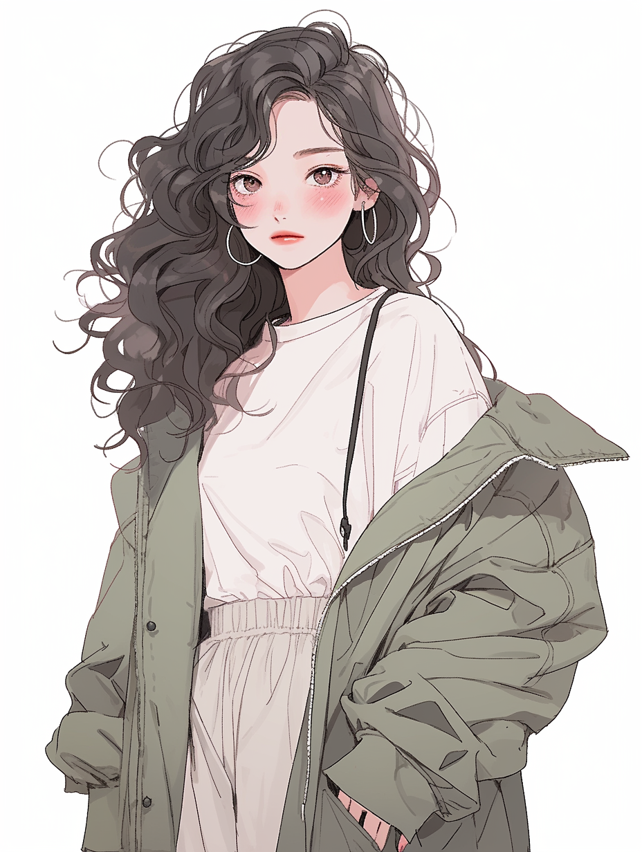清新画报,线条插画,精细钢笔,一位长头发波浪卷发穿长裙的女孩,卡通漫画,在商场,买衣服, 面部清晰细节,干净整洁的画面,超清晰细节,摄影室灯光。