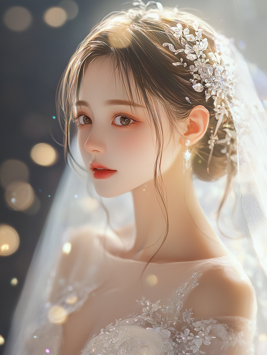 一个女生,身材妙曼,面容精致,大眼睛里透着倔强和坚韧。婚纱是简约而优雅的款式,头发盘起,戴着璀璨的钻石发饰。