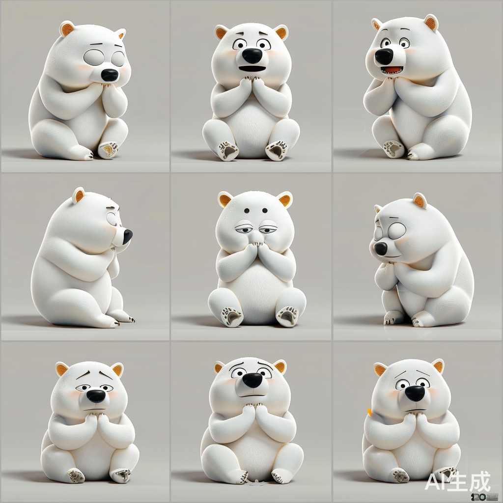 Nine pictures, various postures and expressions,Gray, lovely, polar bear, big round eyes, yellow ears,3D cartoon style, Happy, sad, angry, say hello, say yes, express gratitude, depressed, thinking, embarrassed,duy huynh,caninecore,strong composition, soft colors, high resolution ,A clean background,8k ar 1:1 s 800 niji 6