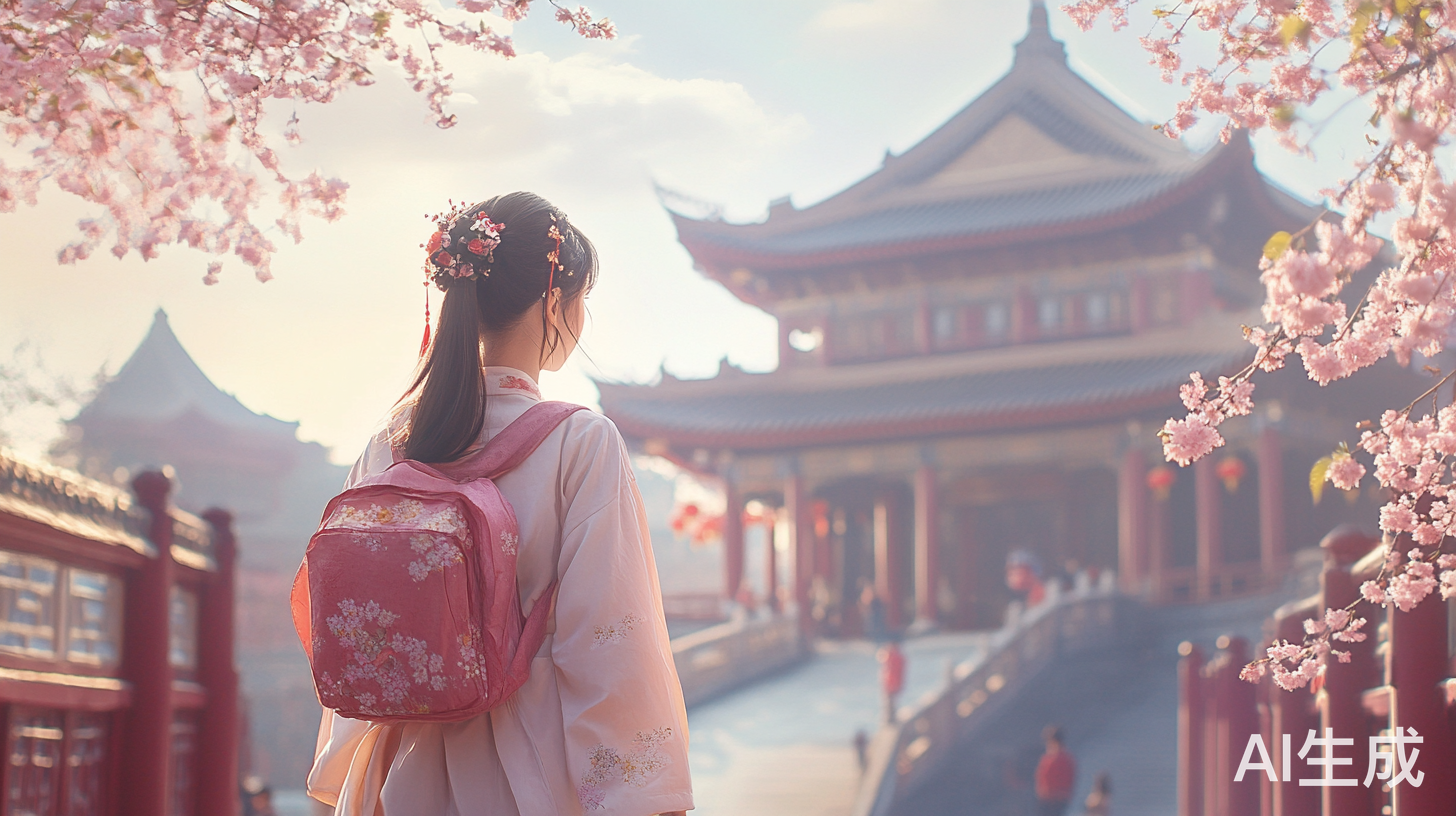 一个穿中国风的女孩在前面,个头很大,衣服和相貌民族特点鲜明➕自信,阳光,奔跑,快乐,友谊 背景是俄罗斯风格建筑➕大连地标性建筑融合,在春日里蓬勃发展➕浪漫温馨,纪念中俄友好建交75周年