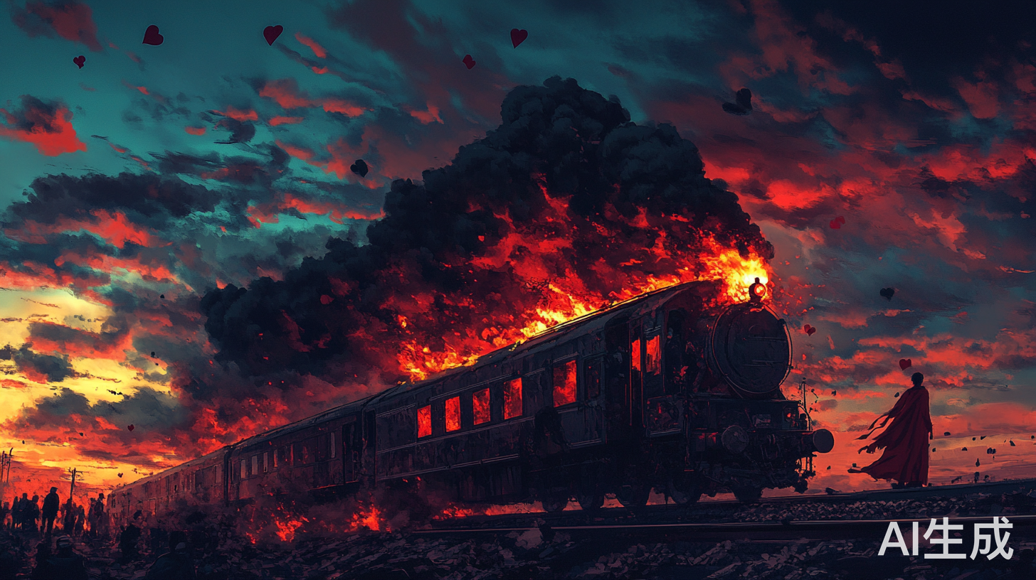 断裂的火车,乌云,围观群众,一个红色戏袍的年轻人燃烧火焰现在断裂火车车顶,漫天飘洒的是红心6的扑克牌