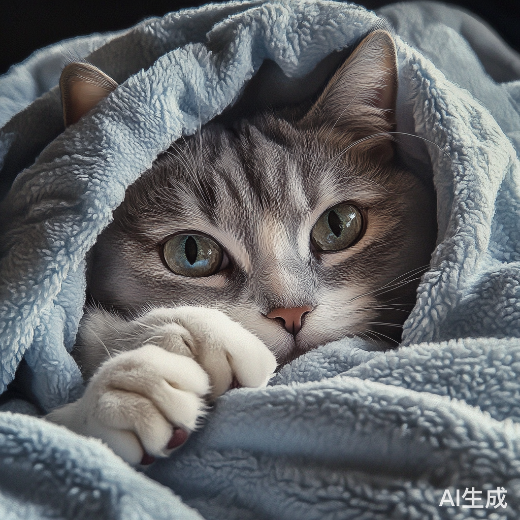 猫躺在床上,上面铺着毯子,何家英的风格,淡银色和深天蓝色,强烈的面部表情,超级细节,画质清晰,