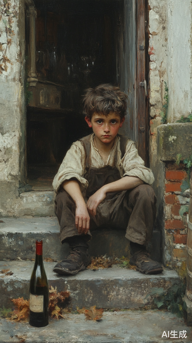 一个惆怅的男孩蹲坐在台阶上,旁边放着未喝完的酒瓶,心情卑微
