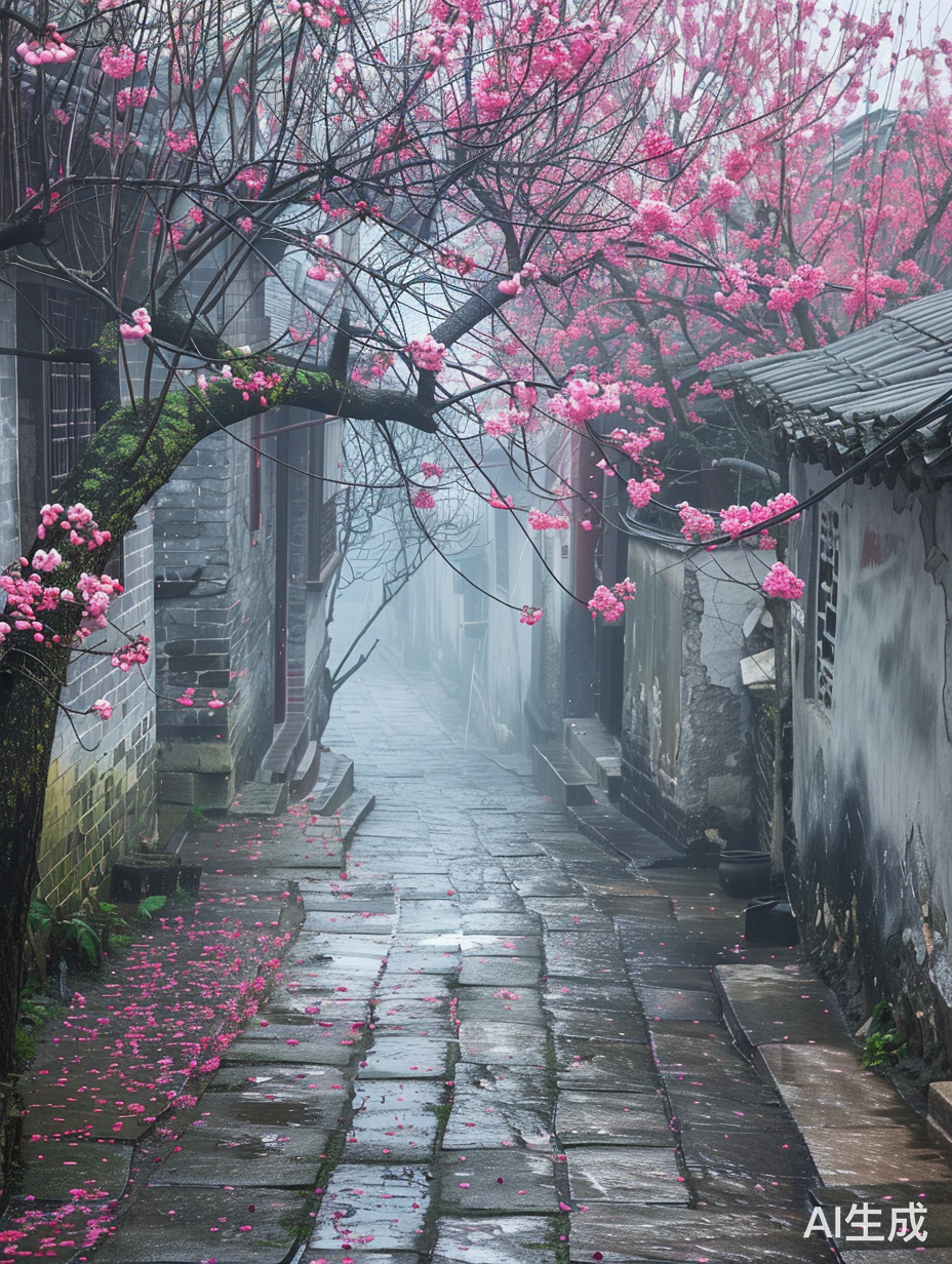 江南小镇,青石板路,烟雨江南 ,桃花盛开