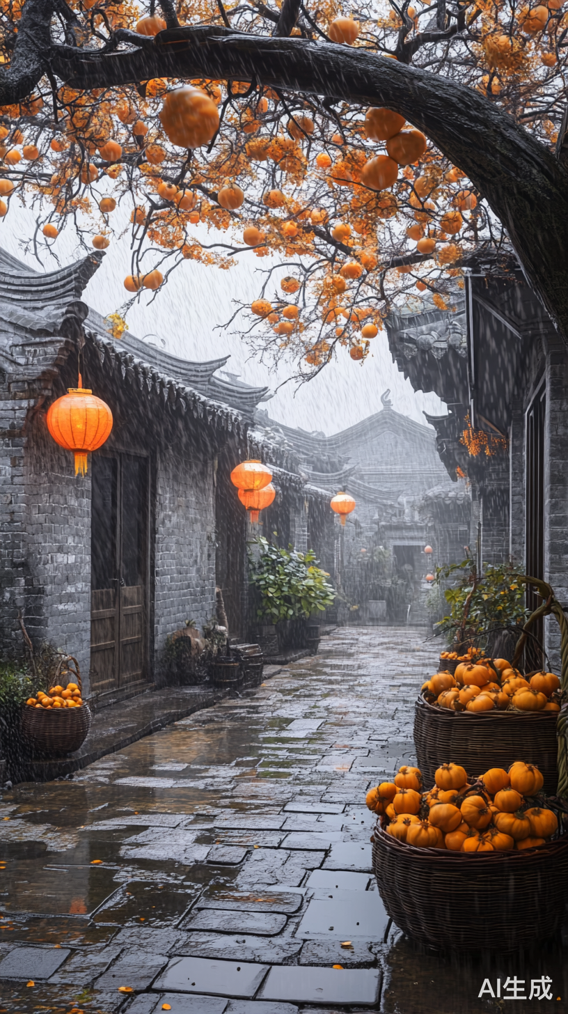 古代建筑的大院子,院子地面干净,且铺满石砖,下雨天,地面有积水,柿子树挂满大柿子,地上有装满柿子的箩筐,屋檐有灯笼。