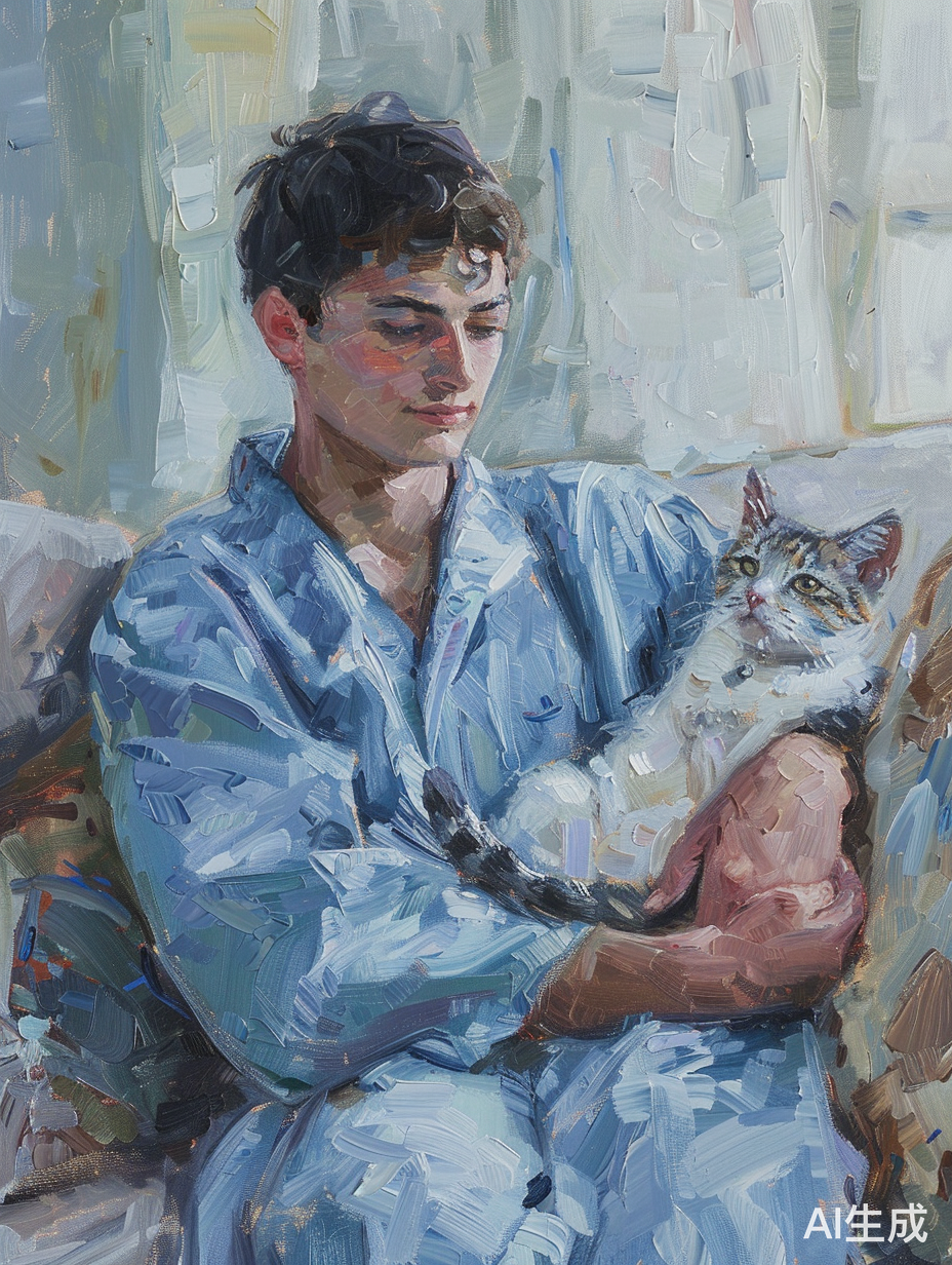 一个年轻男人穿着蓝色长袍,怀里抱着猫,坐在沙发上。油画风格,印象派风格。光影效果强