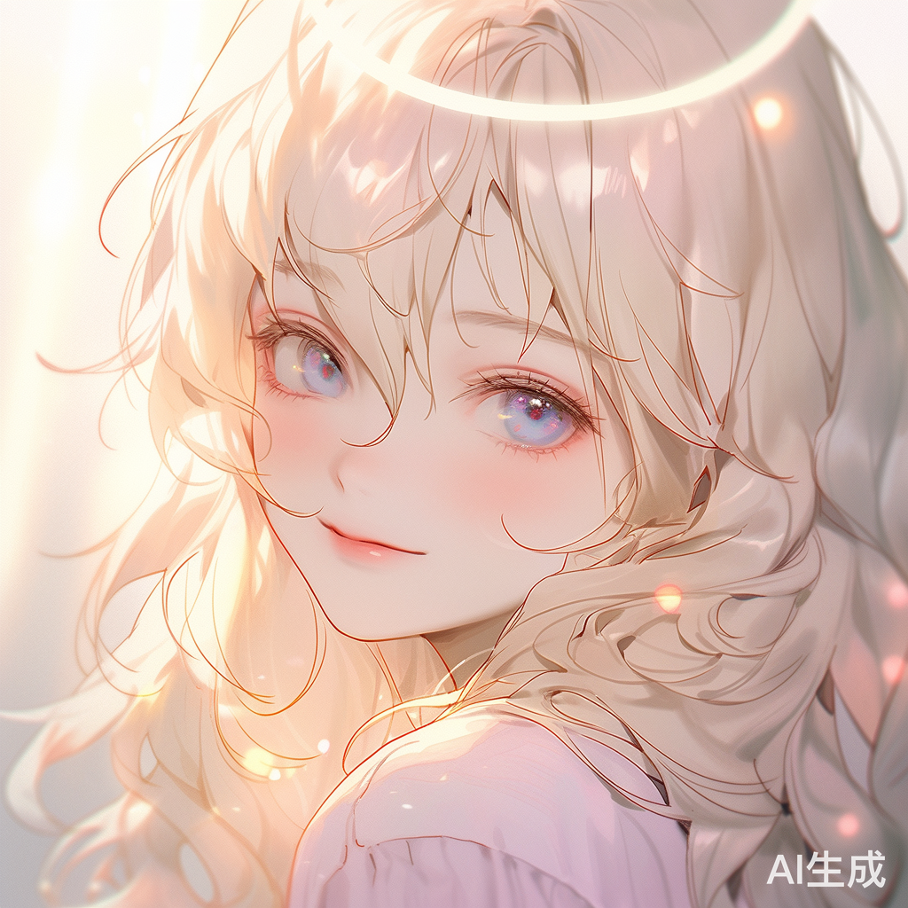 紫色的瞳孔,金发,天使,瘦,长发,卷发,斜刘海,看向观众,精致五官,完美的脸,浅笑,单一色调背景,柔光,少女