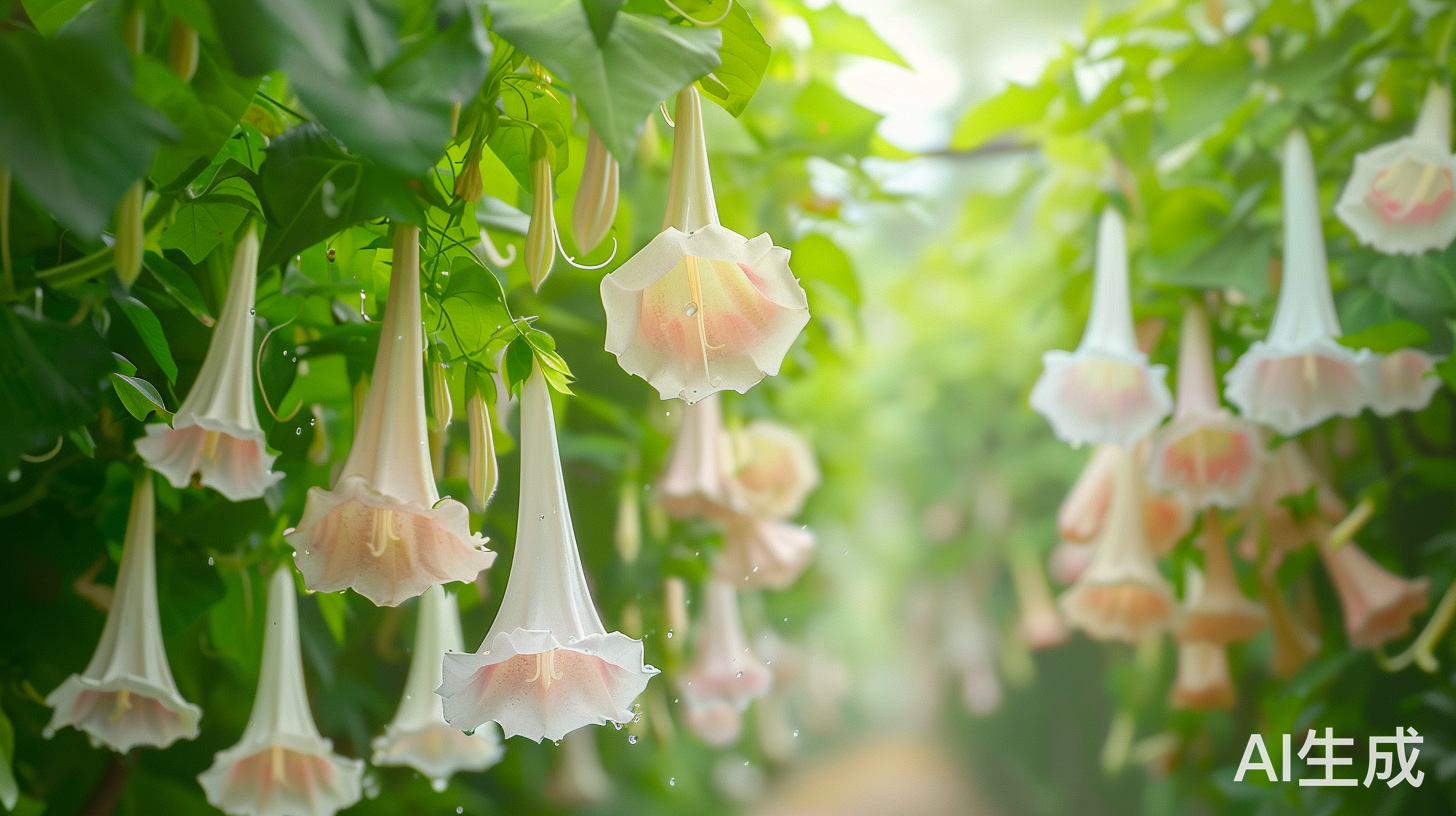 雨后,悬挂在上方的白色和粉红色花朵,喇叭花,风格空灵。背景是虚化的绿植,一条小路从花丛下经过,营造出梦幻般的氛围。超高分辨率。