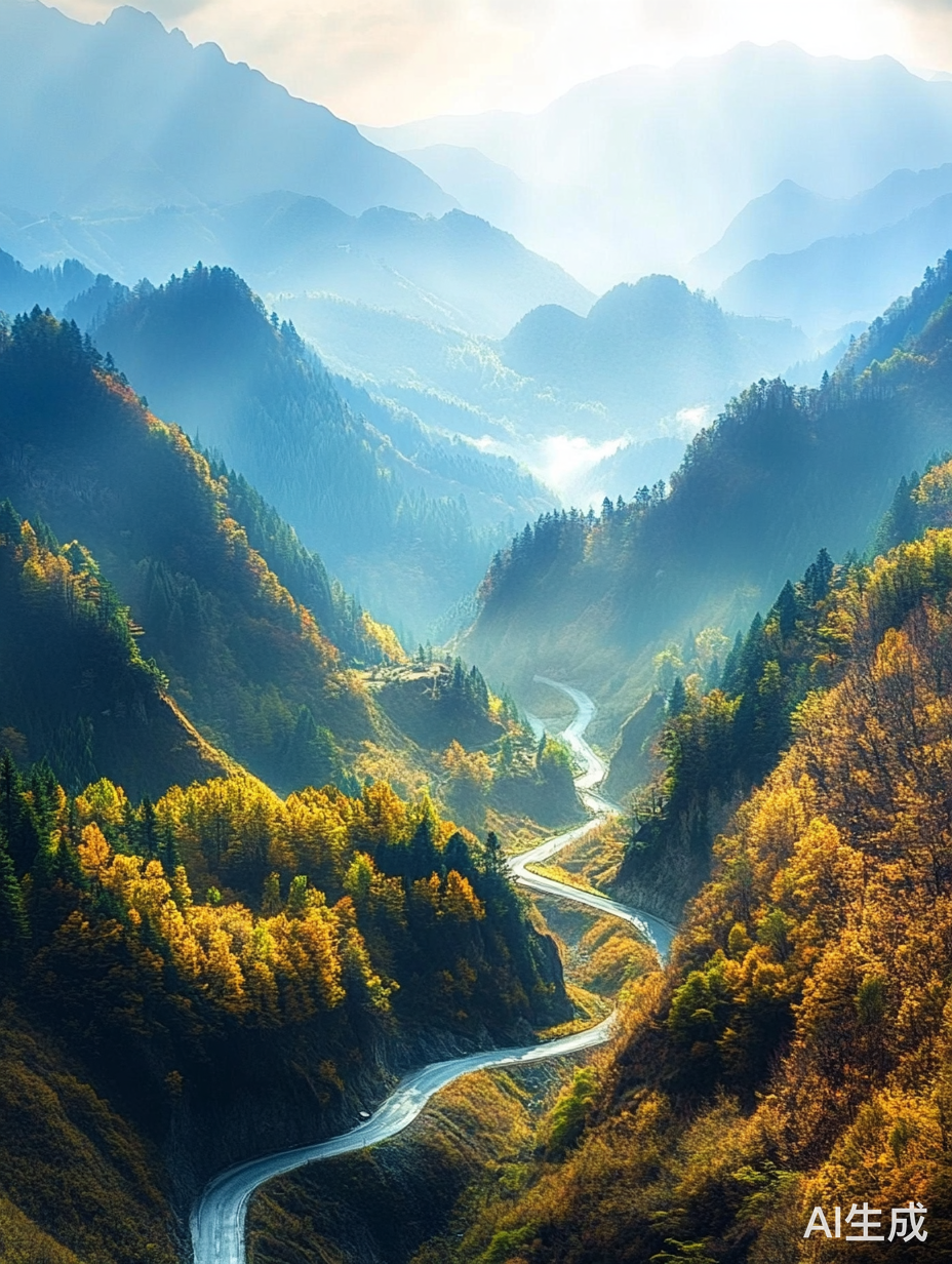 治愈系风景图片,阳光洒向山间,有山有河流有路,绝美的风景,