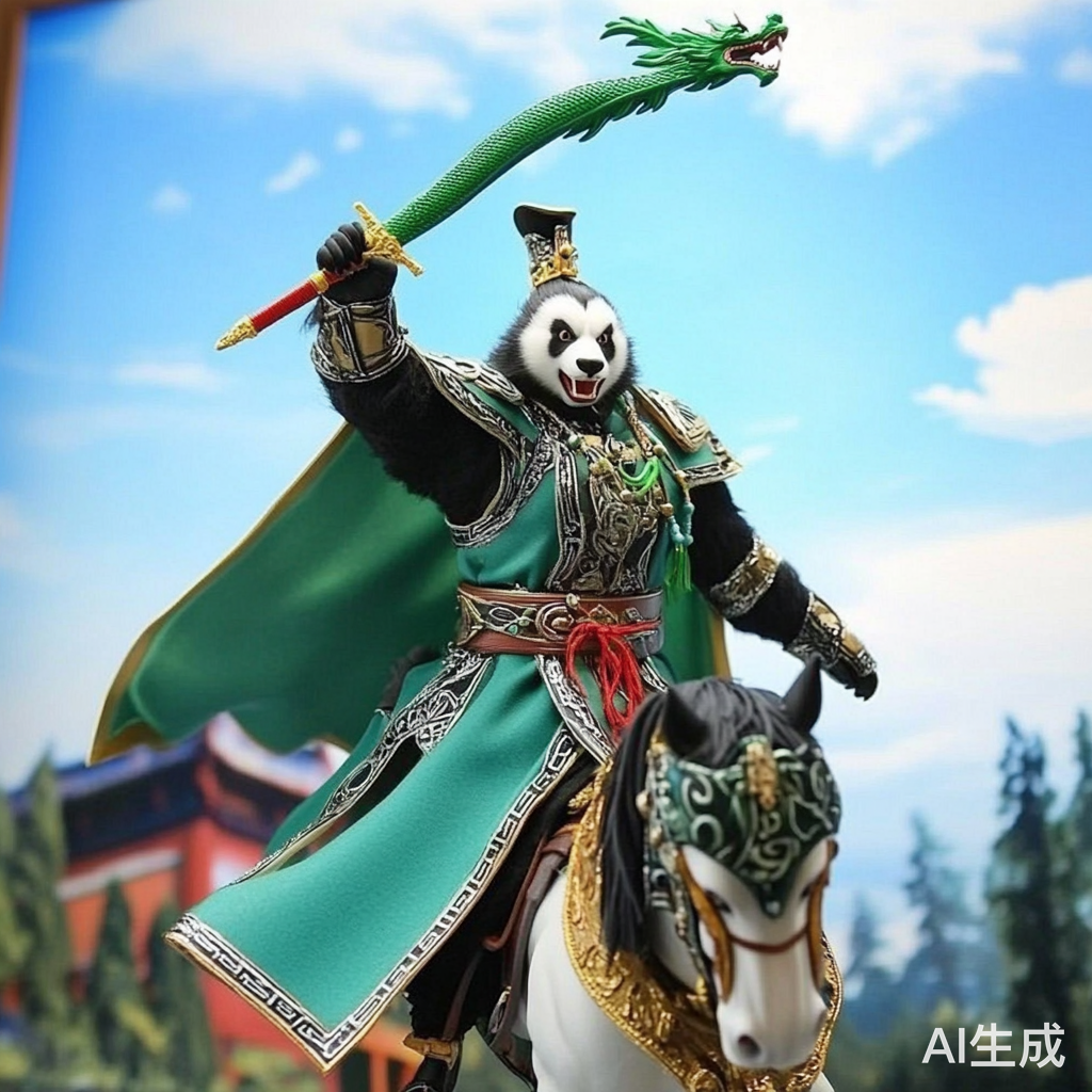 一只熊猫,骑在马上,手里拿着青龙刀,镜头拉远一些,能看手里拿的武器