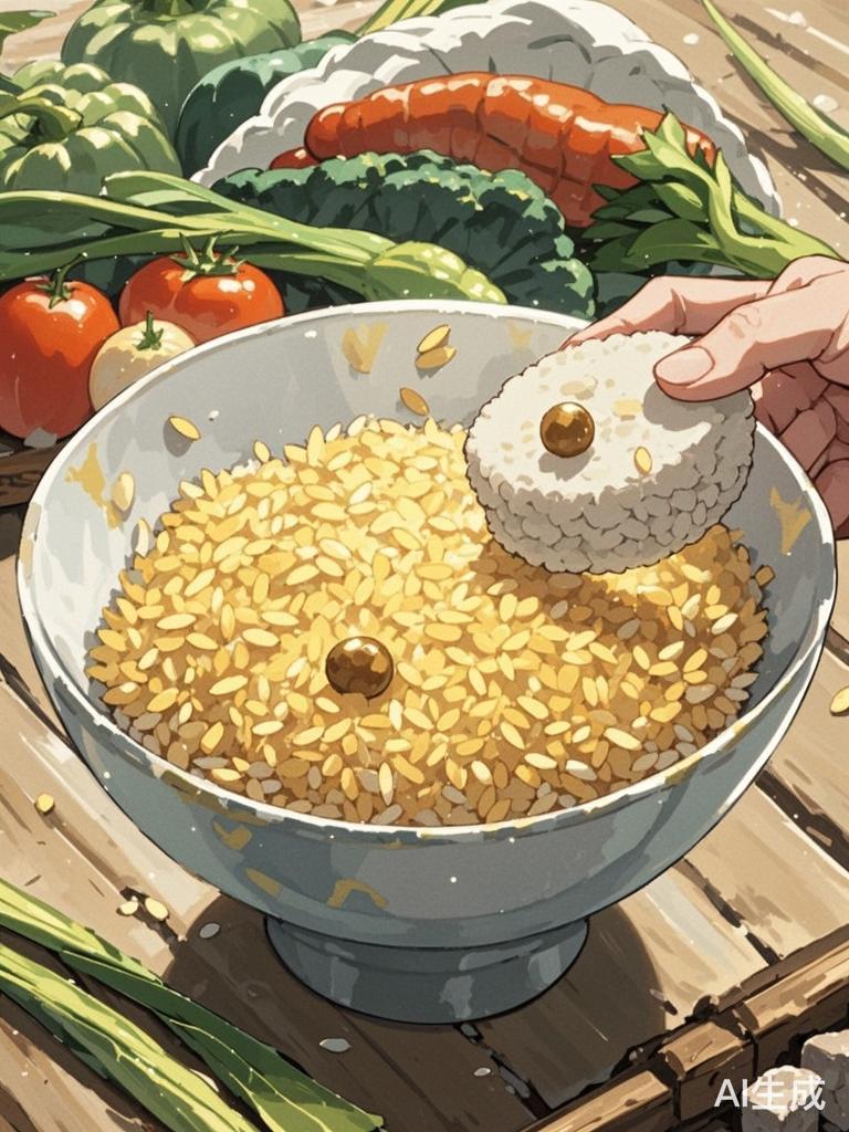 有一个人长着翅膀 翅膀尾巴上有几粒稻米 他蹲在一株稻米前面