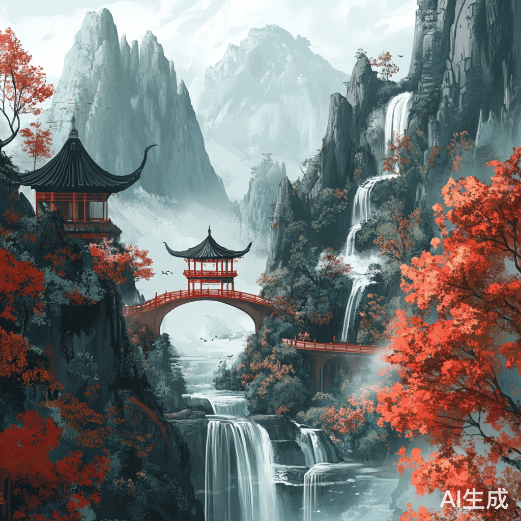巍峨的山脉、溪流、瀑布、亭子、拱桥、枫树,中式插画风