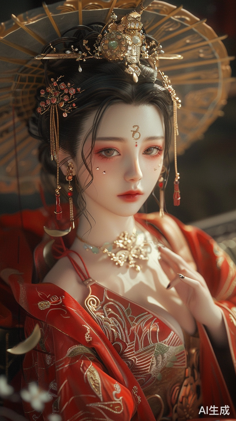 室内,美杜莎女皇,御姐,柳叶弯眉,杏眼红瞳,性感朱唇,瓜子脸,珠宝,8K,黑直长发,胸部饱满,古风服饰,华丽奢侈,红色连衣裙,杰作,细腰,五指如笋,长腿,站立,