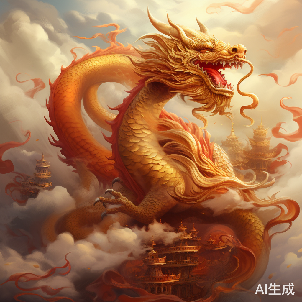 中国风的龙,身体是金色,吞云吐雾,威风凛凛,底色为红色代表吉祥如意,预示着2024年好兆头