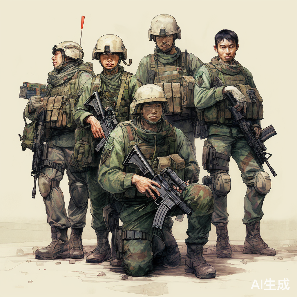 画一群中国军人,要求特种单兵作战的形象,穿戴最新的作战外骨骼,全新最新装备的中国军人形象,对手为美国军人形象