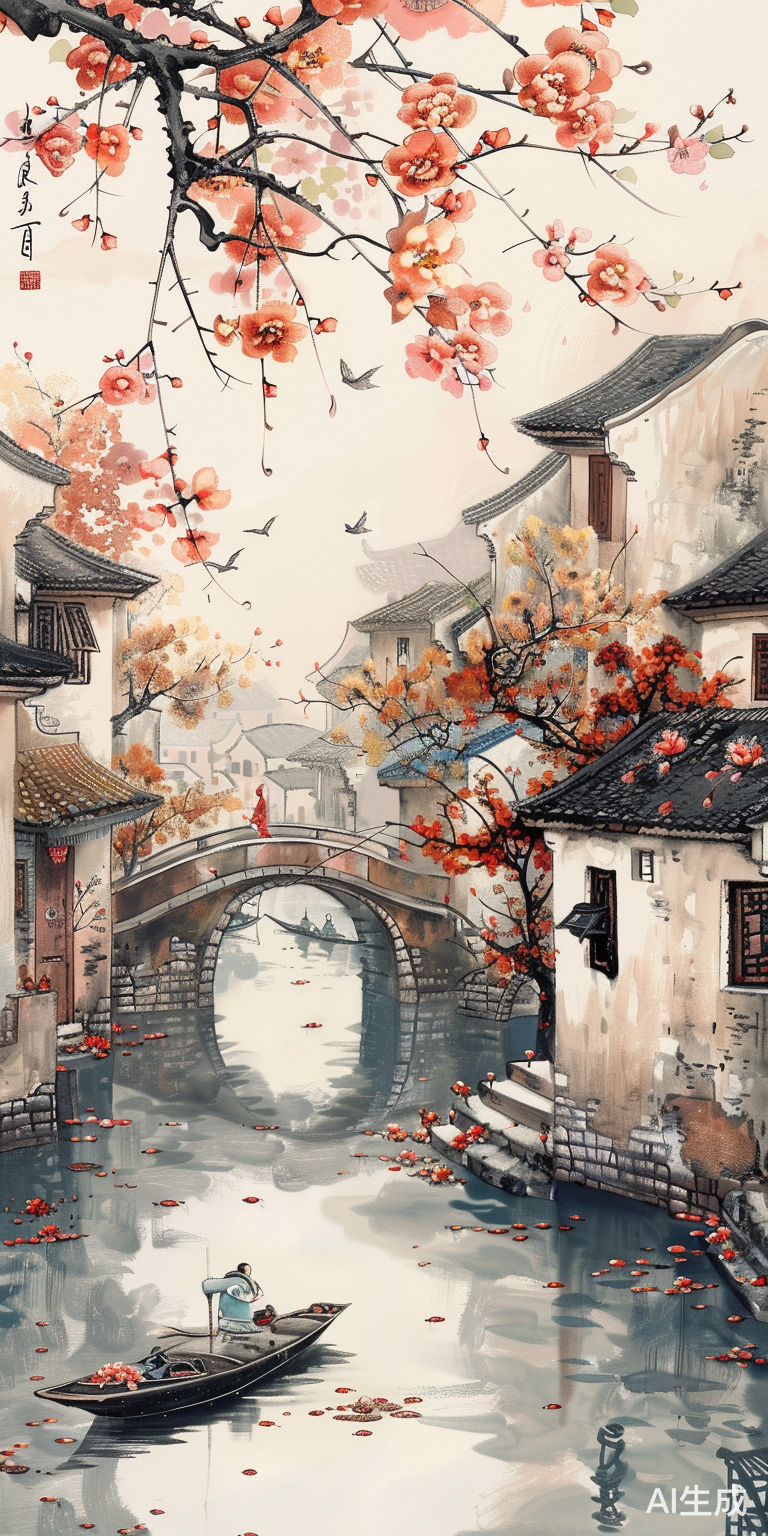 江南水乡,小镇,小船,石桥,小花,齐白石风格,远景镜头