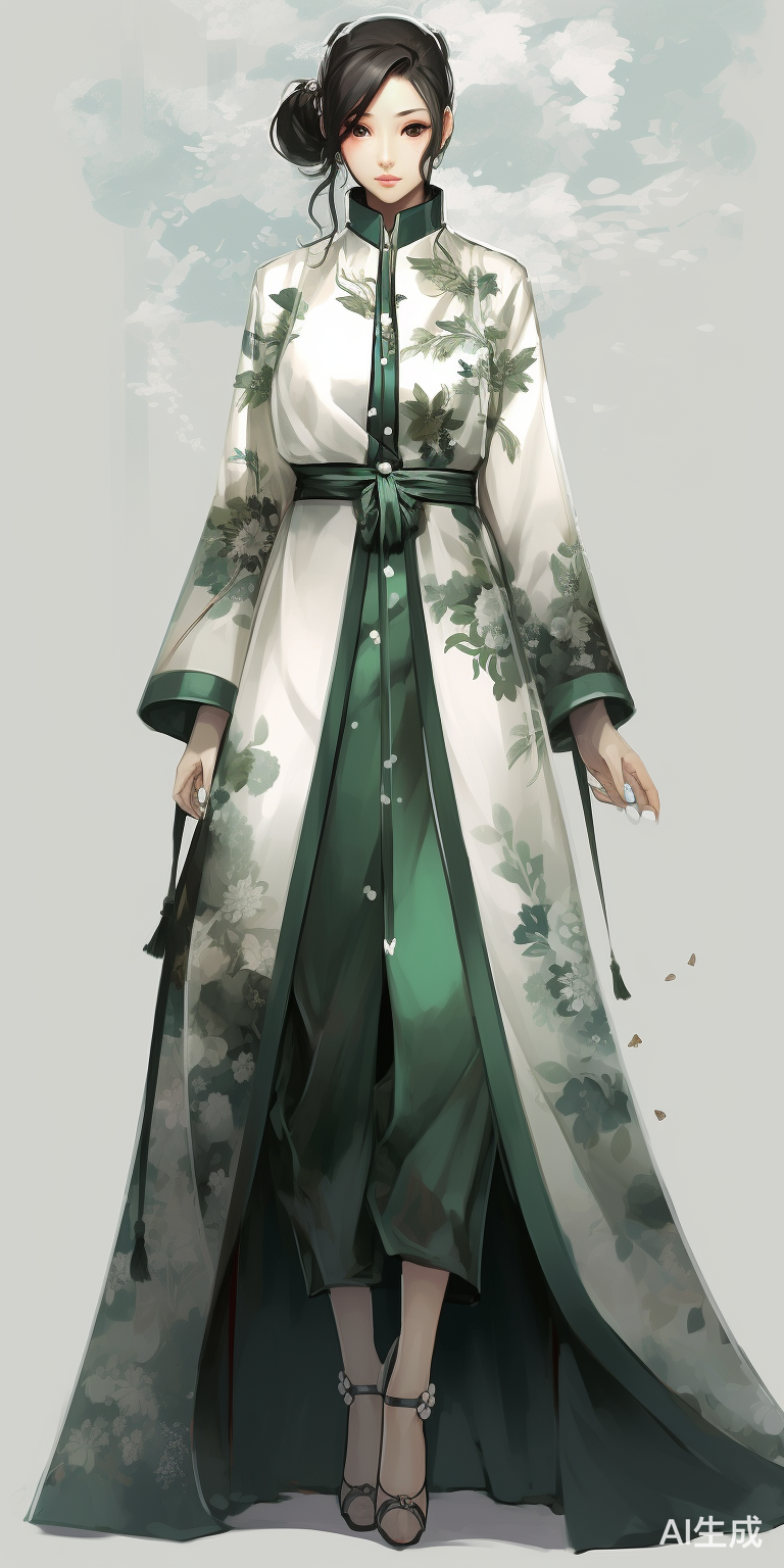 柔和照明,女性,瘦,全身镜头,前视图,新中式,中国风,花朵元素,green and white tones,floral motifs,light flowly midi floral dress,lace,gauze texture,design sheet,rich detail,Clothing style drawing,jasmine, coat suit,pink