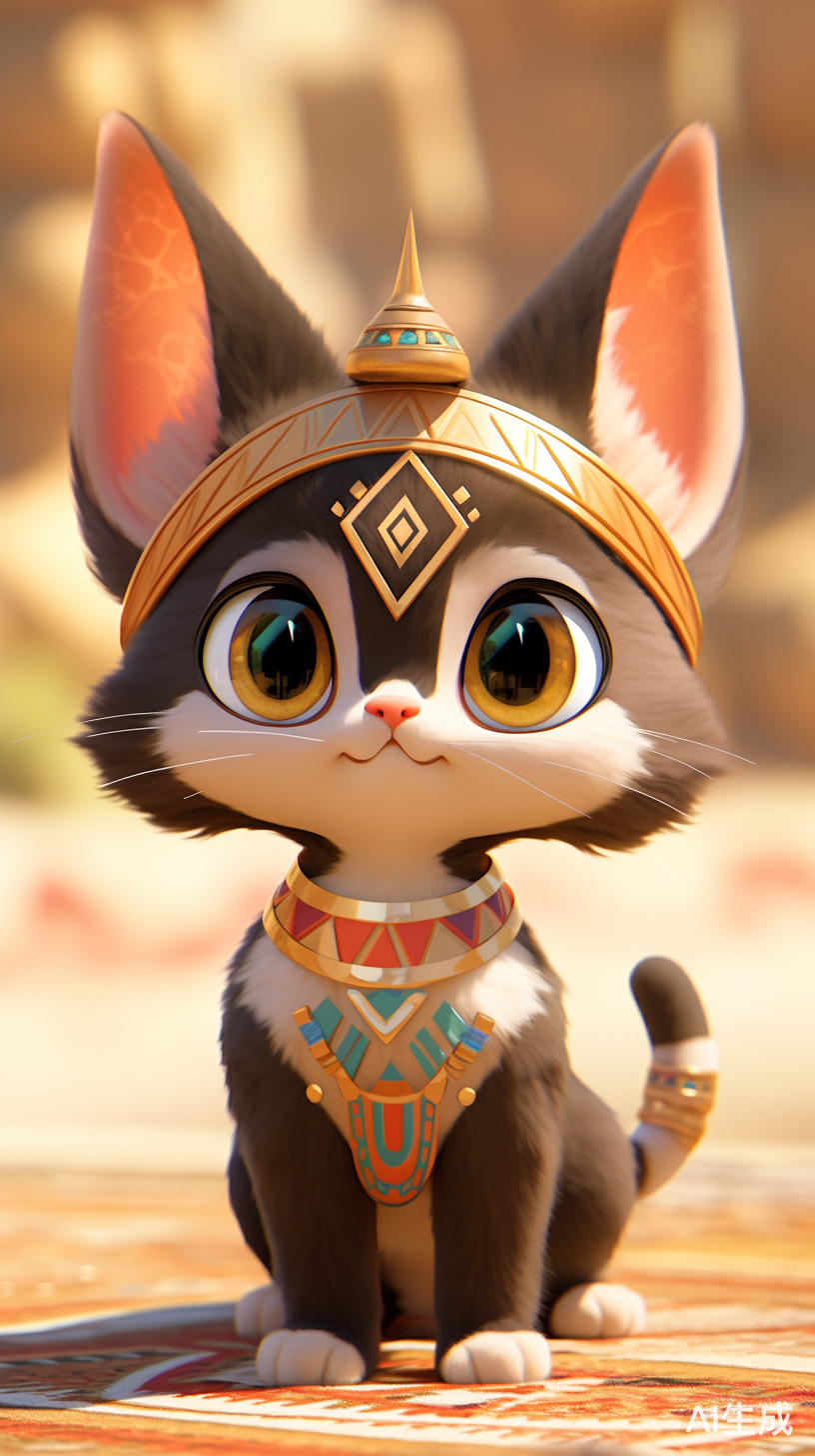 3D,立体,可爱卡通埃及小猫咪,拟人的手法,站立,穿着古埃及金色装饰物和飘带的埃及小猫咪,埃及壁画风格,金字塔,古老感,正脸,可爱,大眼睛,圆嘟嘟