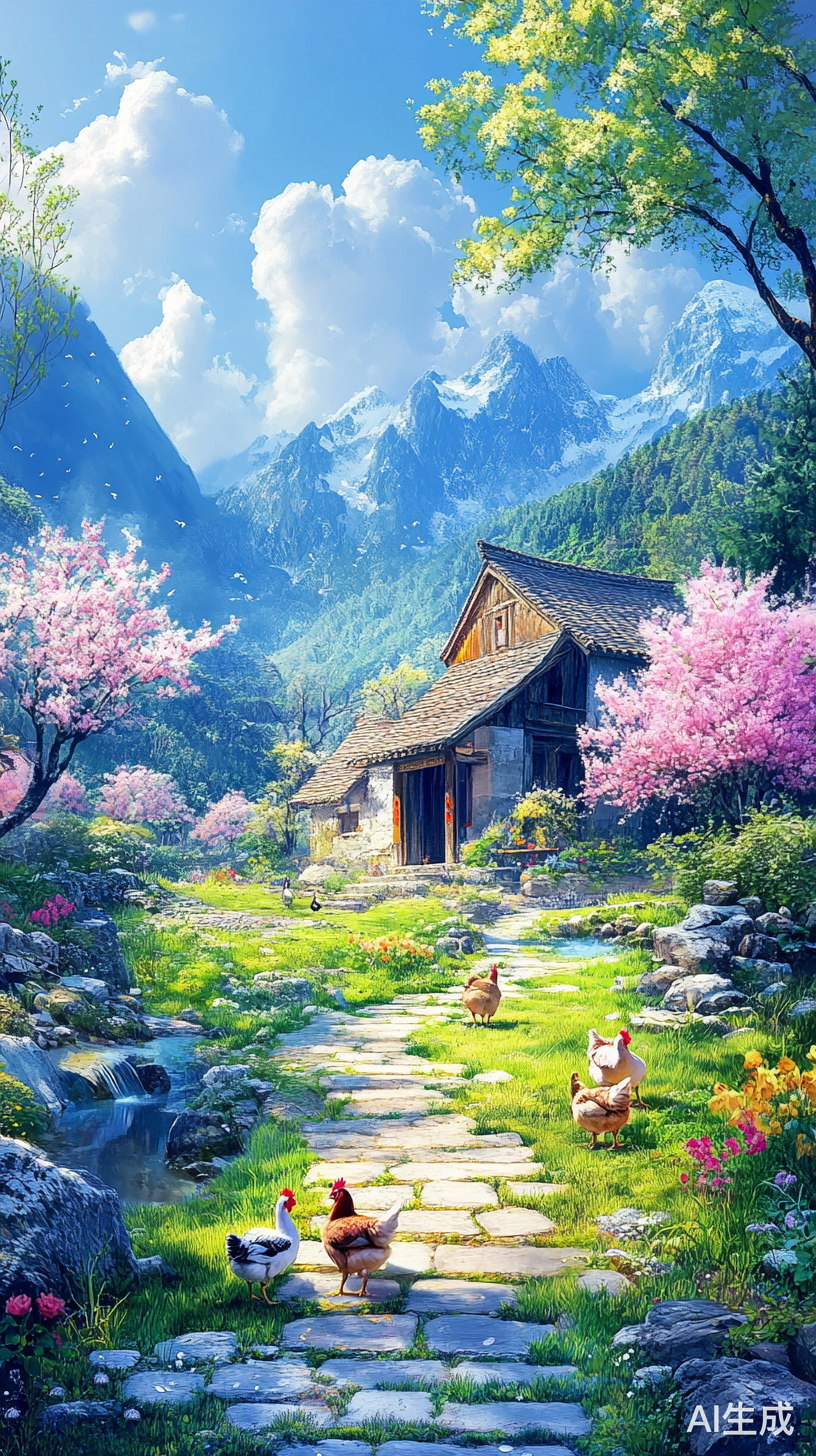 农家小院,花,草,鸡,鸭,鹅,石阶路,小溪流,背景高山,树林,蓝天白云