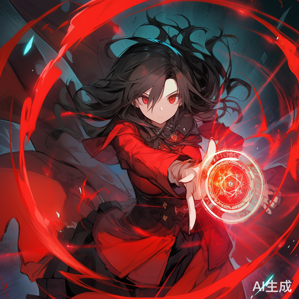 女魔法师,黑发,红眼,背景为巨大法阵,