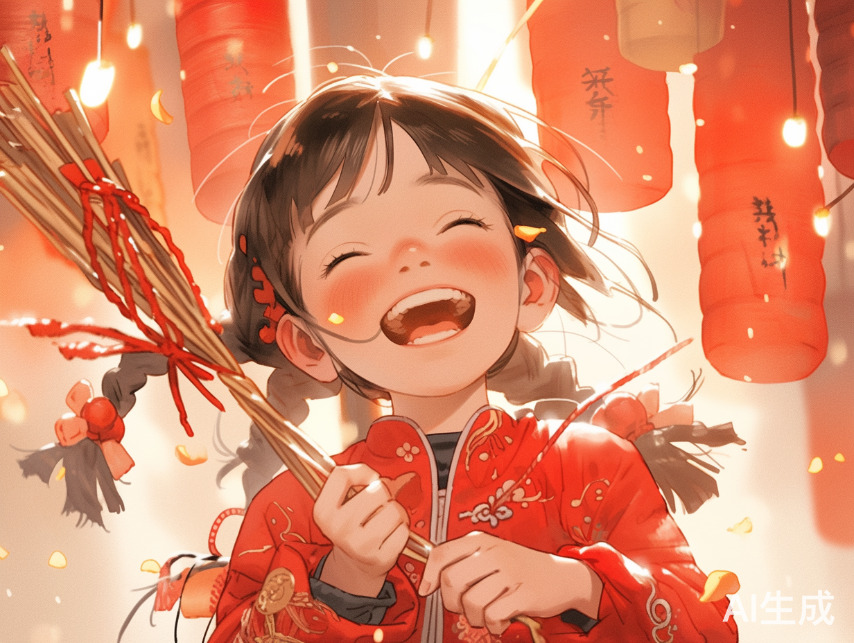 一个可爱的小女孩拿着两串福字鞭炮,全身,表情非常开心,新年氛围,中国风,精致的细节,插画风格,