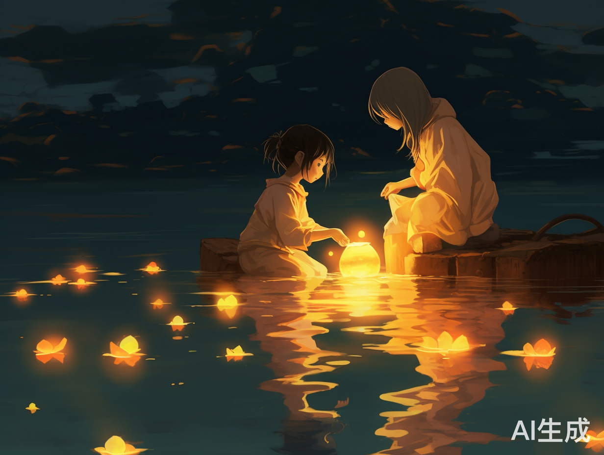 两个小孩晚上在水边放花灯,花灯亮着,背光,唯美场景,细致细节,插画风格